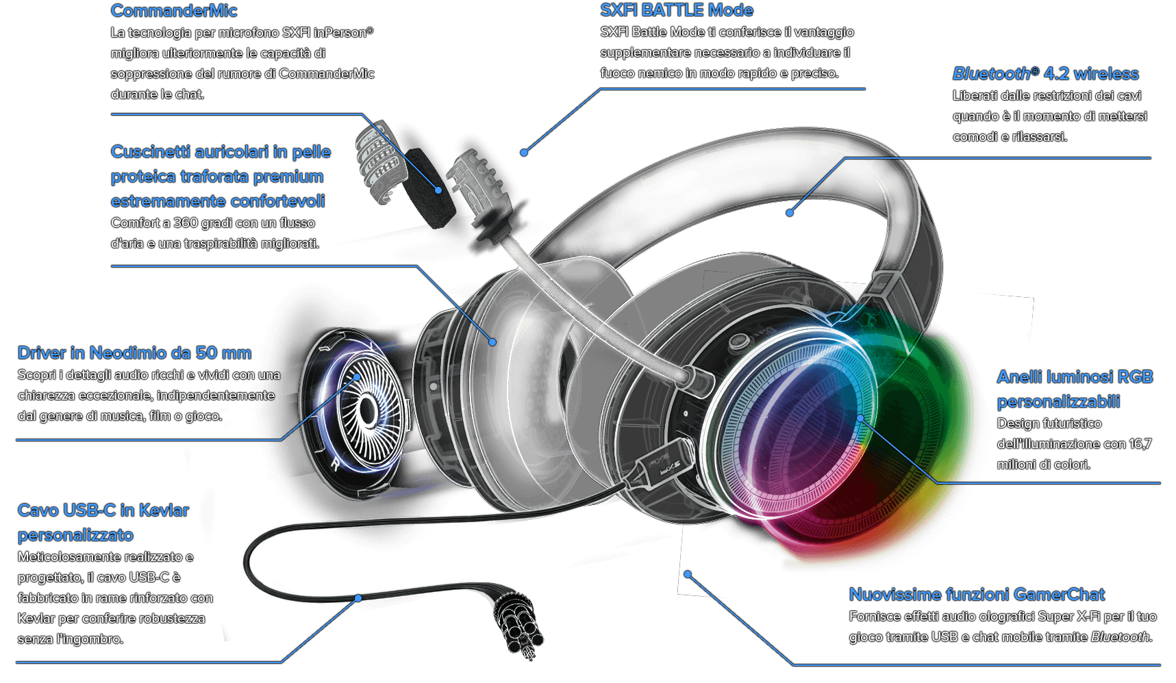 Siamo entusiasti di presentare le nuove cuffie ibride olografiche SXFI AIR GAMER, una versatile cuffia da gioco cablata con Bluetooth 4.2 che ti offre la libertà di collegarti a qualsiasi dispositivo compatibile di tua scelta o di connetterti in modalità wireless per goderti l'audio di Super X-Fi Headphone Holography!