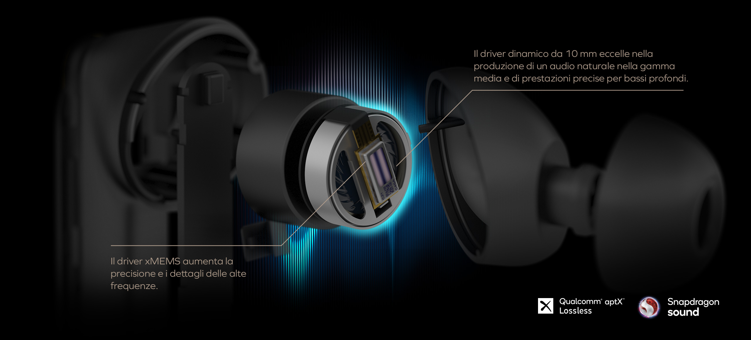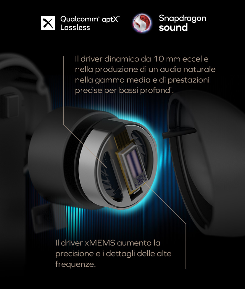 Con l'integrazione della tecnologia Snapdragon Sound aptX Lossless di Qualcomm, il codec audio offre alta fedeltà a 16-bit/44,1kHz, per un'esperienza a livello di CD che ricrea fedelmente la registrazione originale, direttamente nelle tue orecchie.