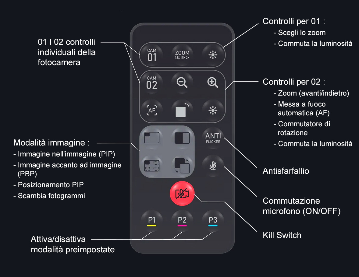Combinando la potenza della doppia fotocamera e il nostro telecomando infrarossi dal design intuitivo, ora puoi passare senza problemi da un'angolazione della fotocamera all'altra con la semplice pressione di un pulsante. Questa funzionalità è particolarmente utile per i content creator che desiderano offrire un'esperienza visiva più dinamica e professionale ai propri sostenitori ed è particolarmente utile per i creatori che ospitano eventi dal vivo come streaming di giochi, interviste o spettacoli di vendita.
