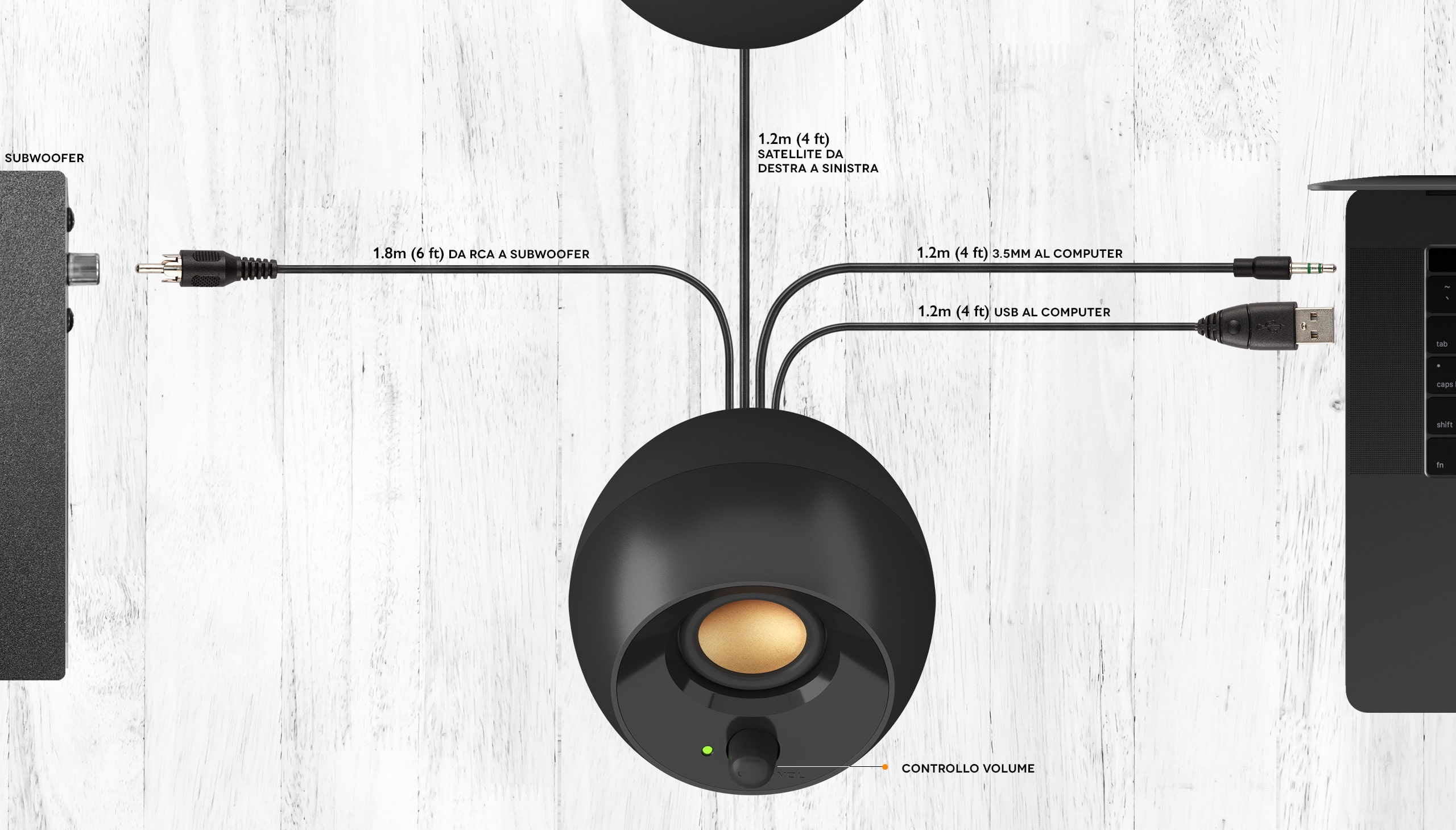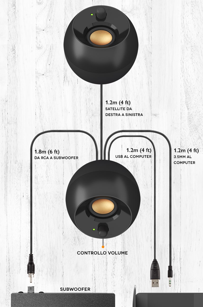Gli altoparlanti sono alimentati esclusivamente tramite collegamento USB, eliminando così la necessità di disporre di una presa a parete. Ti basterà collegare i tuoi dispositivi agli altoparlanti Pebble Plus tramite il cavo AUX-in universale da 3,5 mm per incominciare! Per maggiore comodità, i comandi del volume sono collocati sulla parte anteriore dell'altoparlante principale.