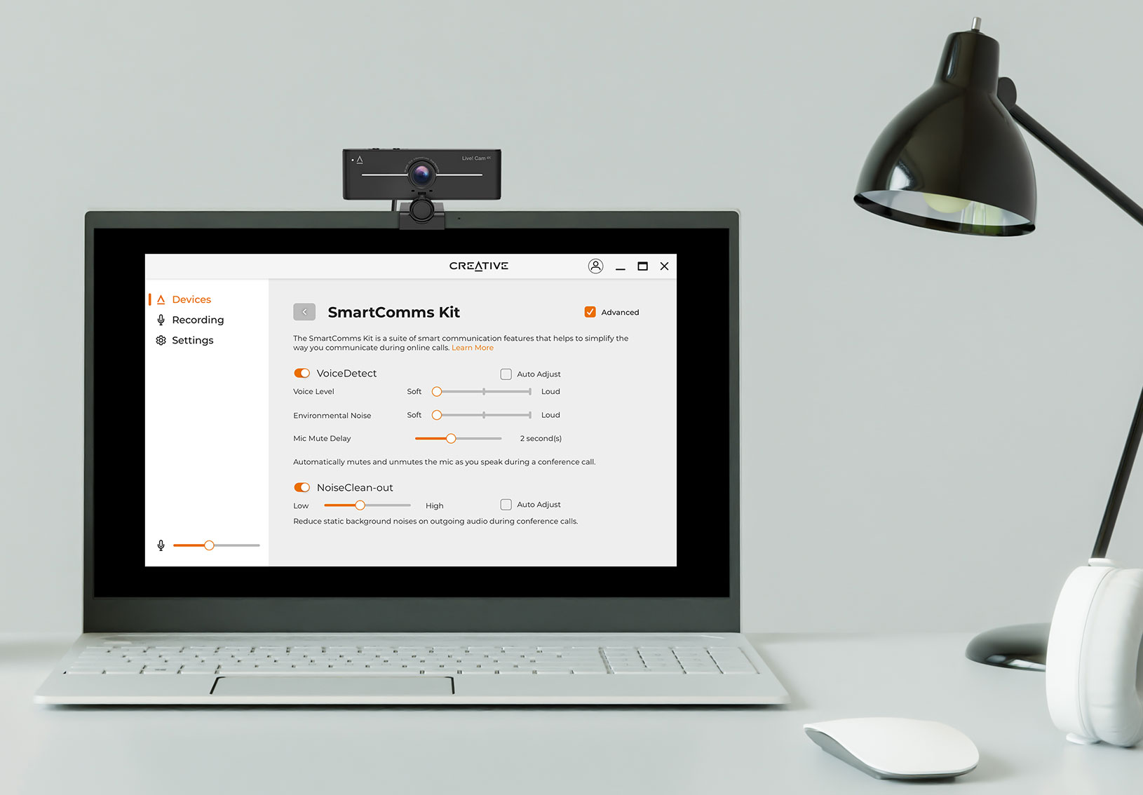 Salta il trambusto delle impostazioni e dei controlli dei microfoni ed evita di distrarti durante una teleconferenza o una sessione di live streaming. Con SmartComms Kit, disponibile tramite l'app Creative, la suite di funzioni di comunicazione intelligente è progettata per aiutarti a parlare e conversare con facilità.